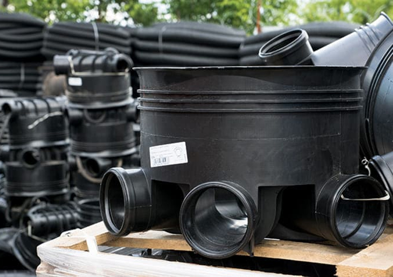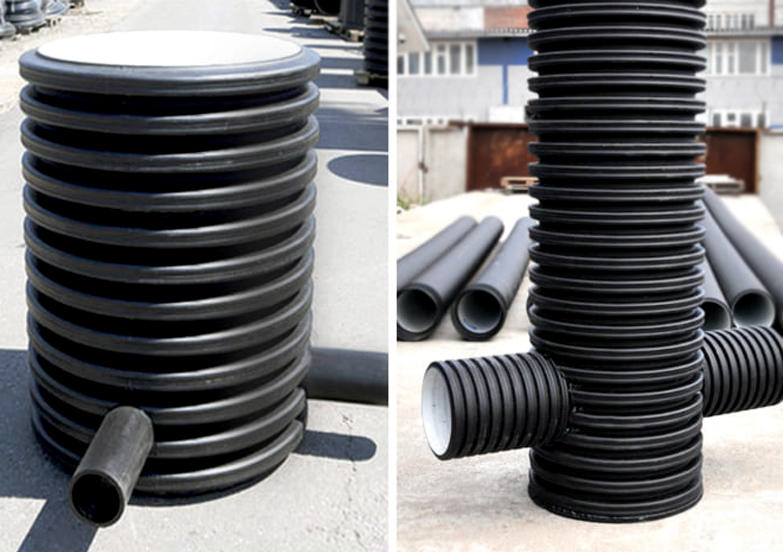 Обычно, дренаж представляет собой сеть пластиковых труб, дренажных колодцев и емкостей. В системе дренажного водоотведения количество колодцев напрямую зависит от расчетного объема удаляемой воды, площади и конфигурации осушаемого участка. Смотровые или инспекционные пластиковые колодцы устанавливаются в местах изменения диаметра, уклона или направления трубопровода наружной канализации. Канализационные инспекционные колодцы предназначены для работ по очистки, проведению инспекции, забора проб.