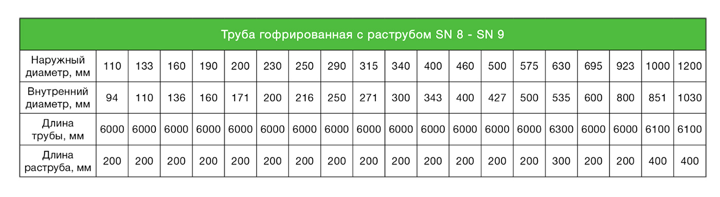 Кольцевая жесткость: SN8 — SN9. Трубы характеризуются высокой химической стойкостью, отличной герметичностью и долговечностью.