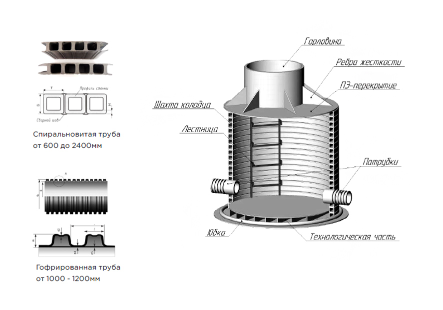 В мировой практике системы канализации с использованием пластиковых колодцев находят широкое применение. Это обусловлено высокими эксплуатационными показателями колодцев. Применение пластиковых колодцев в составе сетей канализации обеспечивает их долговечность и ремонтопригодность. Пластиковые или полимерные канализационные колодцы «РП» изготавливаются по ТУ 2291-002-09283206-2014 методом экструзионной сварки из спиральновитых многослойных труб и условно гофрированных труб СВТ или КОРСИС.