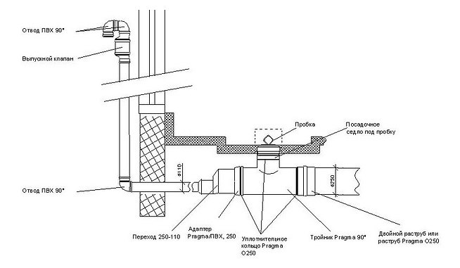 Так как установка посадочного седла под пробку происходит уже после заливки бетонной подготовки под ванны, то при укладке трубы достаточно только соблюсти требуемый уклон и привязать точки выхода вертикальной трубы тройника через дно будущей ванны. Высота установки седла на этом этапе не имеет значения, труба выпускается с небольшим запасом относительно отметки дна будущей ванны. После отсыпки трубы и заливки бетонной подготовки, производится обрезка выступающей части трубы в нужный размер и установка седла пробки. После этого производится установка опалубки и заливка дна и стенок ванны. При этом во всех ваннах верхний край седла пробки автоматически оказывается заподлицо с дном.
